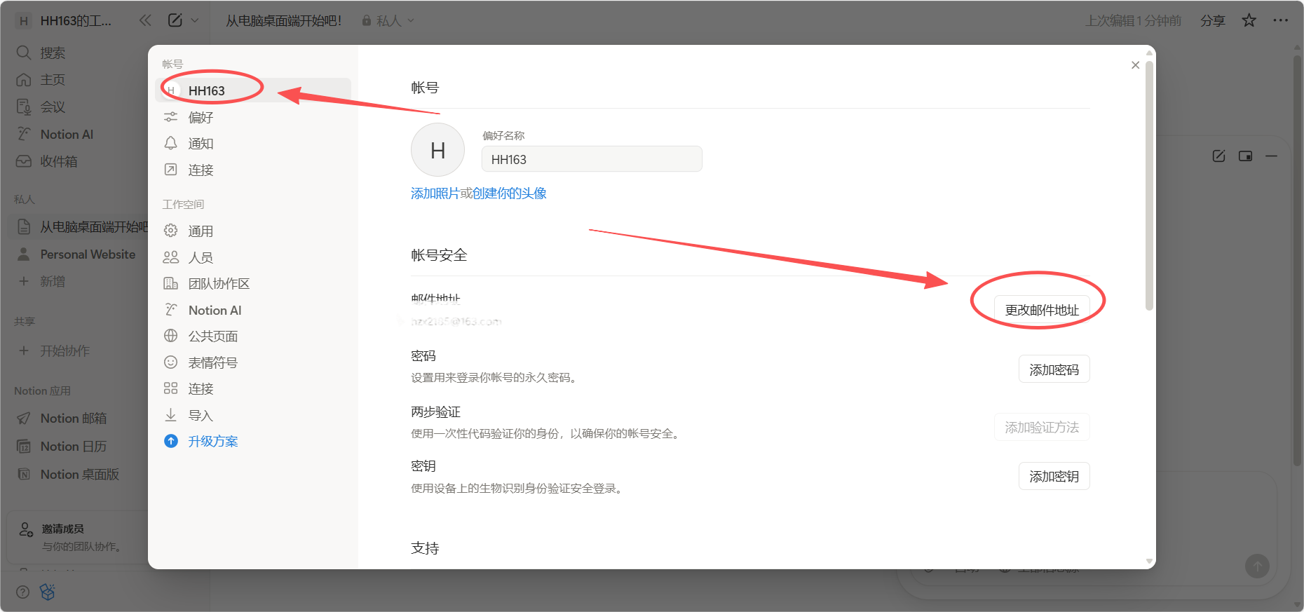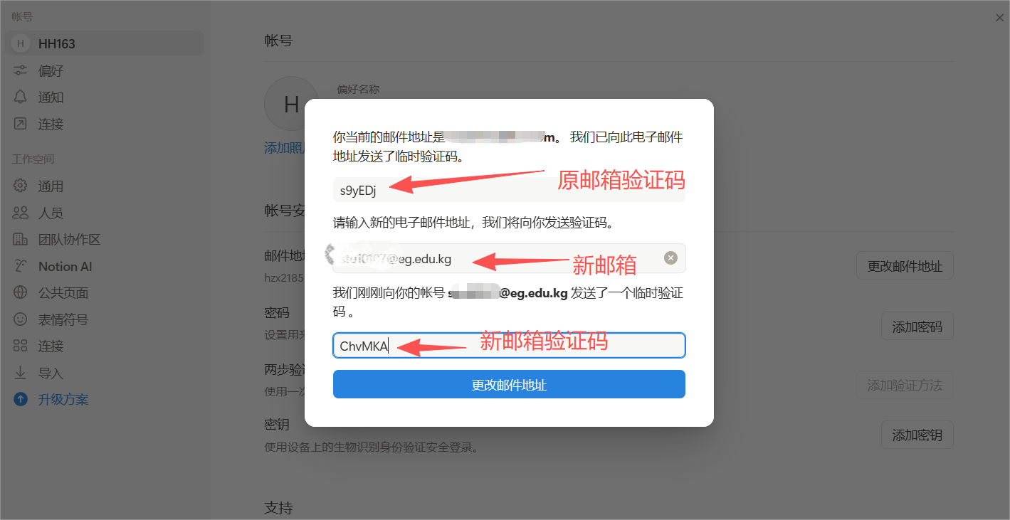 - 点击“更换邮件地址”,先输入原邮箱验证码,再填教育邮箱地址并验证。